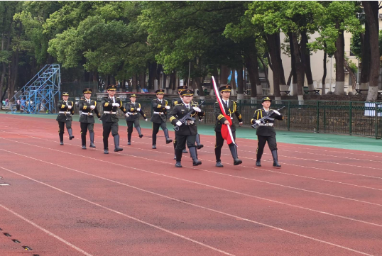 国旗护卫队迈着整齐有力的步伐护送国旗入场,升旗仪式在庄严的国歌声中拉开帷幕,五星红旗冉冉升起,全场师生肃立致敬,满怀着对祖国的热爱与敬意。