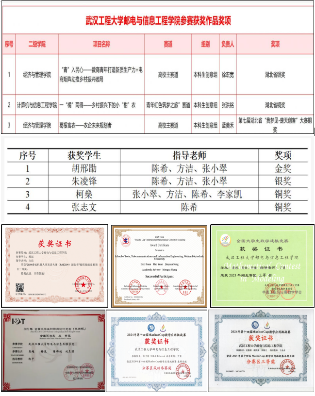 曾获湖北省优秀教学成果二等奖,湖北省三全育人先进个人,湖北省优秀教学成果二等奖; 优秀共产党员、先进工作者、教学名师等。